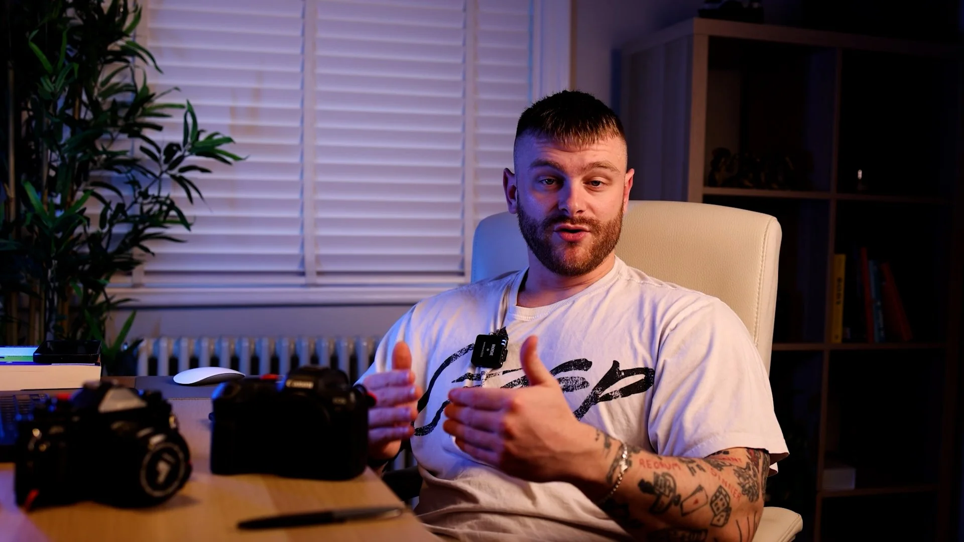 A person with tattoos on their arms is adjusting a camera, looking down at its screen, with a dark background.